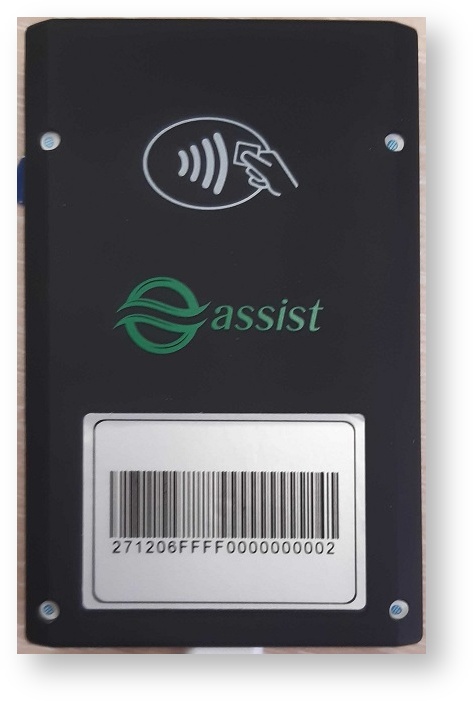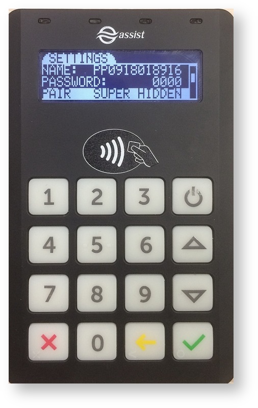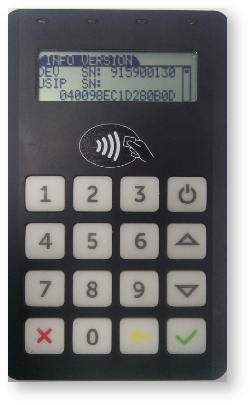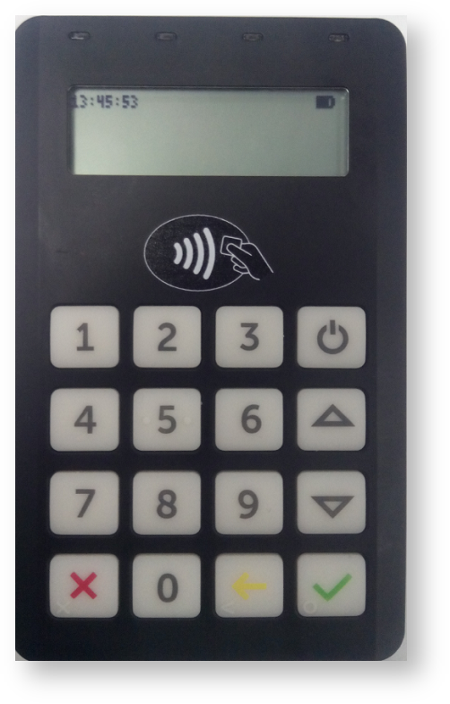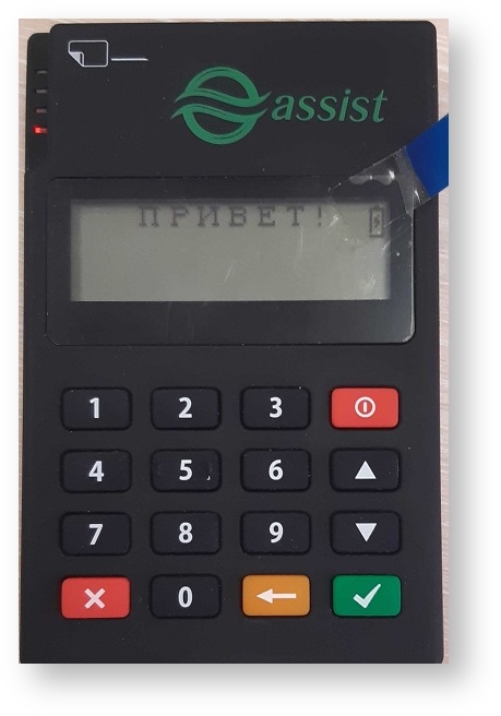 Включение беспроводного терминала осуществляется с помощью нажатия и удерживания кнопки включения, при этом загорается синий светодиод. На экране включенного беспроводного терминала отображается приветствие.