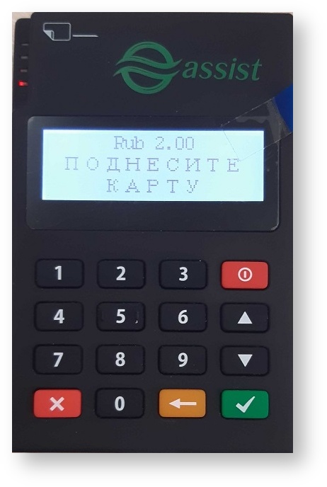 Карту следует прикладывать к обратной стороне терминала в том месте, где находится логотип бесконтактной оплаты.