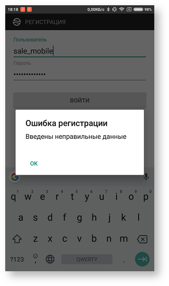 Если регистрация прошла неуспешно (были указаны неверное имя пользователя или неверный пароль), на экране отобразится следующее сообщение.
