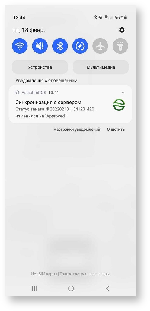 При запуске приложения дополнительно осуществляется проверка наличия заказов за последние 3 суток, которые были оплачены OFFLINE или имели статус «В процессе». Информация по таким заказам автоматически обновляется. Результаты обновления отображаются в виде уведомлений от приложения на смартфоне.