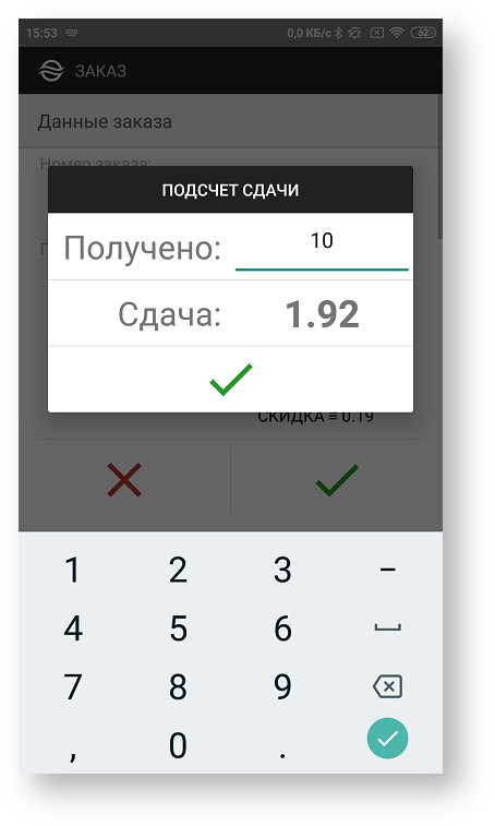 Если в строке суммы заказа ввести значение полученной от покупателя суммы, то в строке сдачи отобразится точное значение сдачи, причитающейся покупателю.