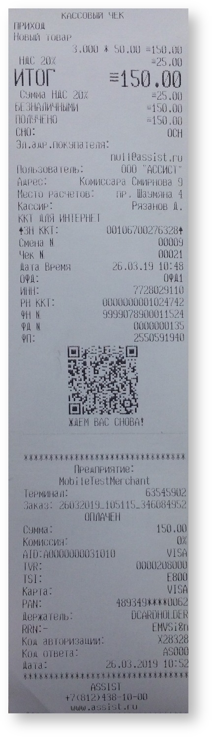 Ниже представлен внешний вид чека, напечатанного фискальным принтером после успешного платежа.