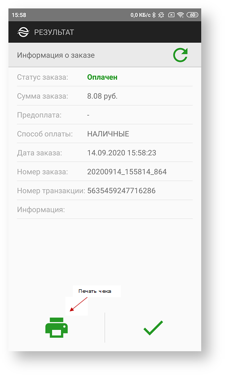 При наличии подключенного принтера можно распечатать чек об оплате. Подключение принтера описано в разделе "Подключение принтера"