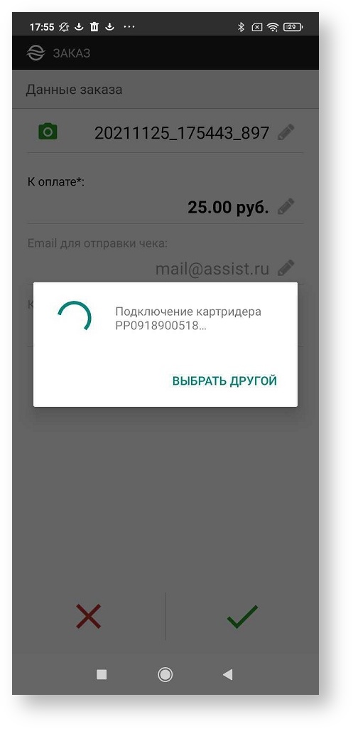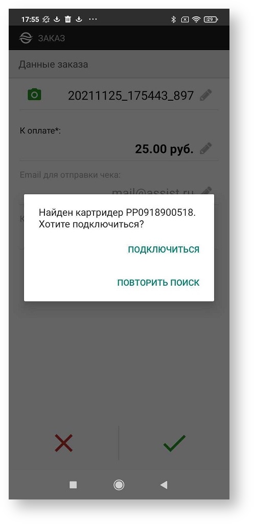 Если перед оплатой соединение смартфона и беспроводного терминала не было установлено или ранее установленное соединение по каким-либо причинам было потеряно, то приложение инициирует создание такого соединения.