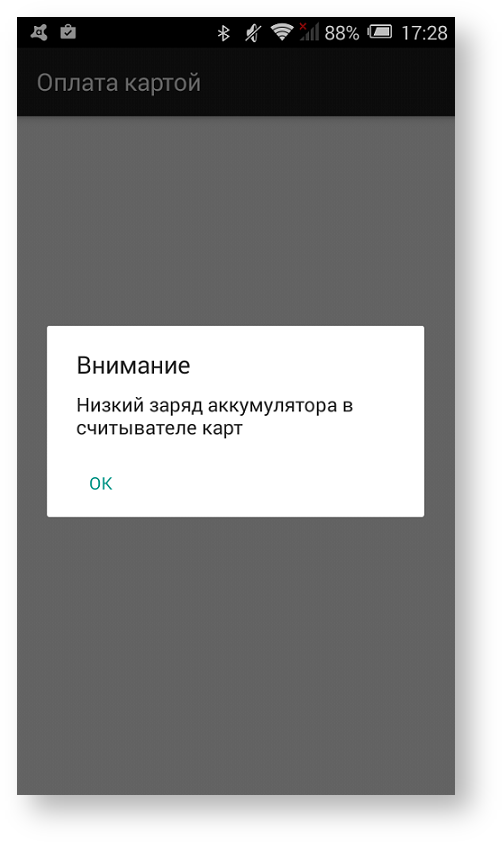 При недостаточном заряде батареи беспроводного терминала в приложении Assist mPOS выводится соответствующее сообщение: