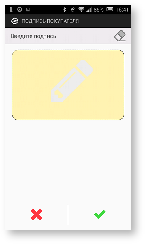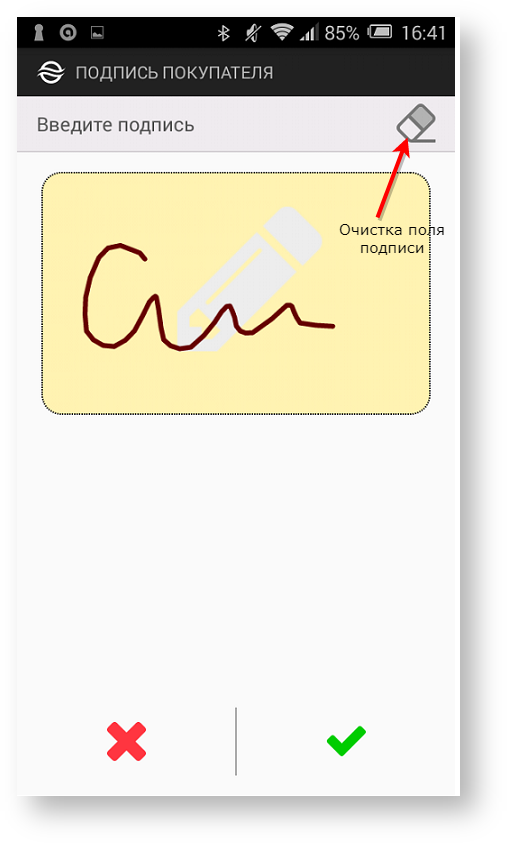 Кнопка в правом верхнем углу экрана позволяет очистить поле подписи и заново выполнить подпись, если первоначальный вариант по каким-то причинам не устраивает покупателя.