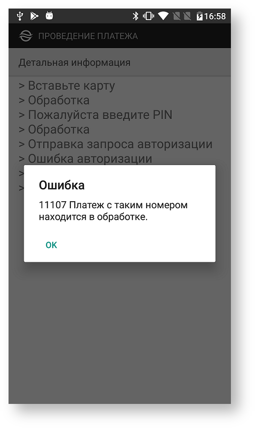 Также вероятна ситуация, когда обработка платежа все еще не завершена. В этом случае при попытке совершить повторный платеж на экране отображается следующее сообщение: