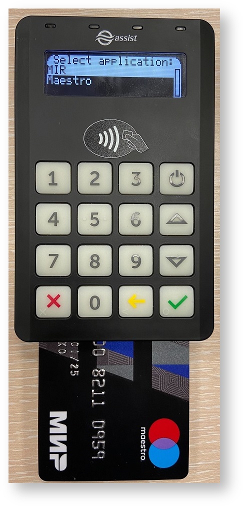 При оплате с помощью чипа и использовании беспроводного терминала Bluepad выбрать платежную систему для осуществления платежа можно непосредственно на терминале.
