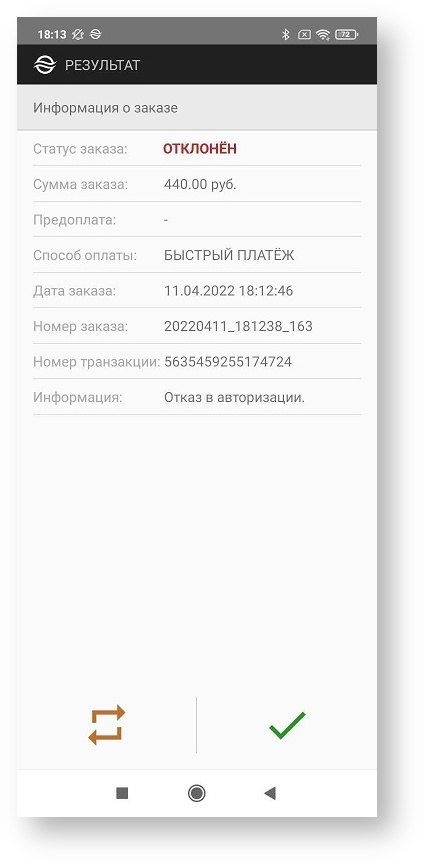 Кнопка «» осуществляет возврат к первому экрану приложения (или в приложение предприятия). С помощью специальной кнопки можно повторить попытку платежа (например, после пополнения карты).