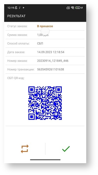 Если проведенный платеж имеет статус «В процессе», то приложение будет автоматически запрашивать результат платежа до его получения, при этом отображается иконка обновления: