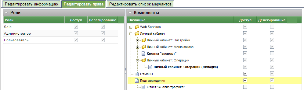 - в открывшемся окне редактирования прав в разделе «Компоненты» в колонке «Доступ» поставить галочки напротив пунктов «Отмены» и «Подтверждения» и/или пункта «Кнопка «экспорт»;