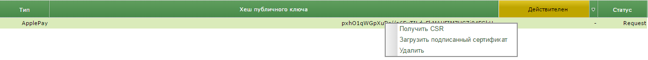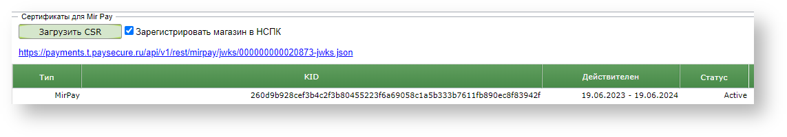 В этом блоке отображается таблица текущих сертификатов Mir Pay предприятия.