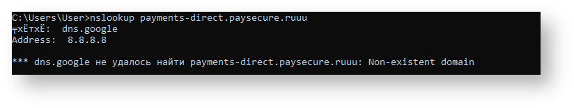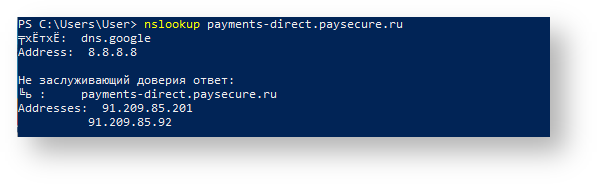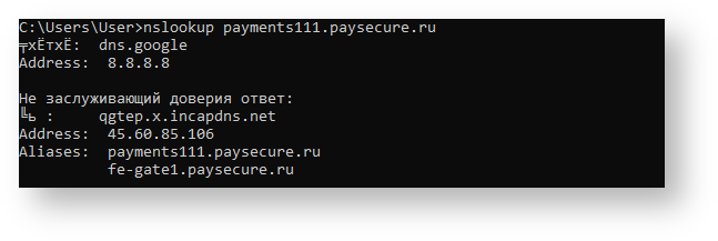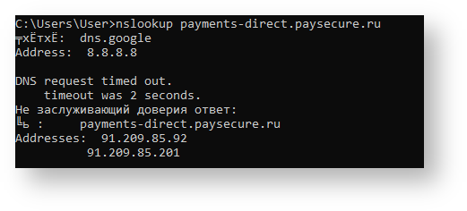 Для диагностики службы DNS, проверки DNS записей сервера payments-direct.paysecure.ru и обнаружения проблем, связанных с разрешением имен в системе DNS используется команда в командной строке (cmd):