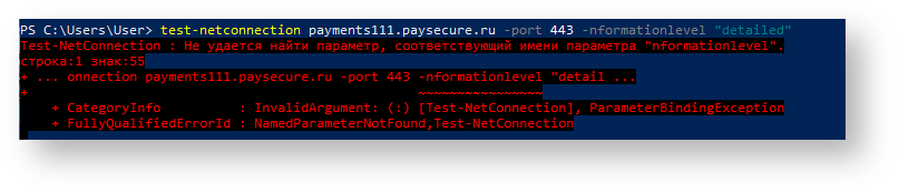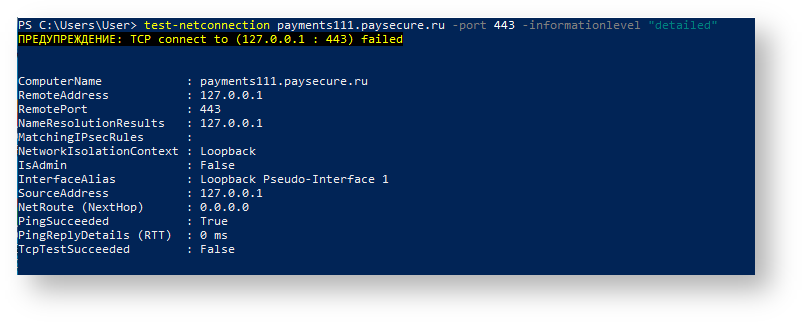 test-netconnection payments111.paysecure.ru -port 443 -informationlevel "detailed"