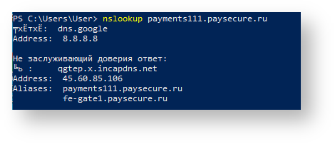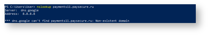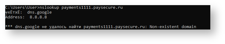 Для диагностики службы DNS, проверки DNS записей сервера payments111.paysecure.ru  используется команда в командной строке (cmd):