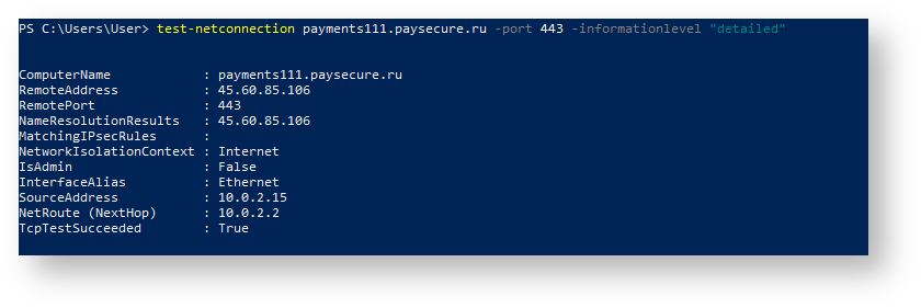 Для проверки доступности 443 порта (HTTPS) сервера payments111.paysecure.ru из сети пользователя применяется команда в Powershell: