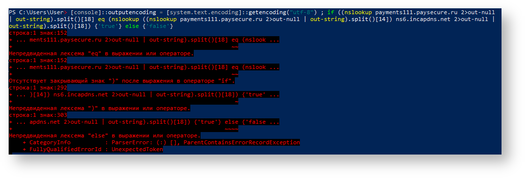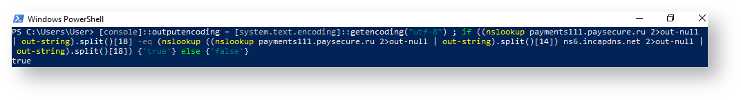 [console]::outputencoding = [system.text.encoding]::getencoding("utf-8") ; if ((nslookup payments111.paysecure.ru 2>out-null | out-string).split()[18] -eq (nslookup ((nslookup payments111.paysecure.ru 2>out-null | out-string).split()[14]) ns6.incapdns.net 2>out-null | out-string).split()[18]) {'true'} else {'false'}