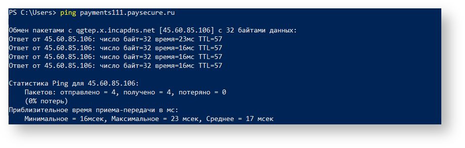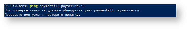 Для проверки целостности и качества соединения с сервером payments111.paysecure.ru используется команда в Powershell:
