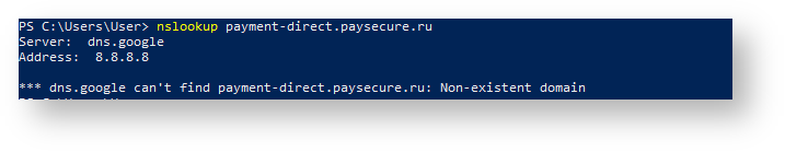Для диагностики службы DNS, проверки DNS записей сервера payments-direct.paysecure.ru и обнаружения проблем, связанных с разрешением имен в системе DNS используется команда в Powershell: