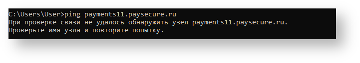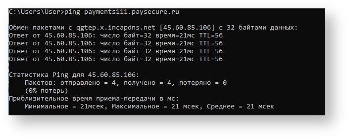 Для проверки целостности и качества соединения с сервером payments111.paysecure.ru используется команда в командной строке (cmd):