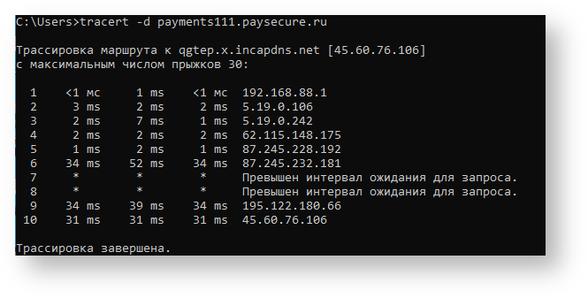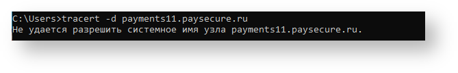 Для определения маршрута, то есть пути прохождения пакетов до сервера payments111.paysecure.ru, используется команда в командной строке (cmd):