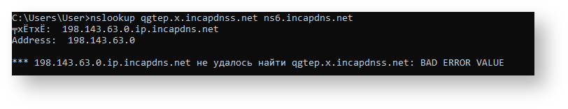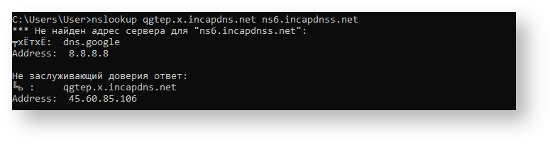Для диагностики службы DNS, проверки DNS записей сервера qgtep.x.incapdns.net (имя сервера может быть иным, см. результат предыдущей команды) через DNS запись ns6.incapdns.net используется команда в командной строке (cmd):