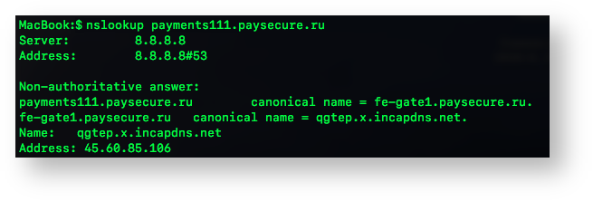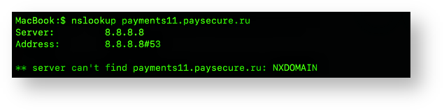 Для диагностики службы DNS, проверки DNS записей сервера payments111.paysecure.ru используется команда в терминале: