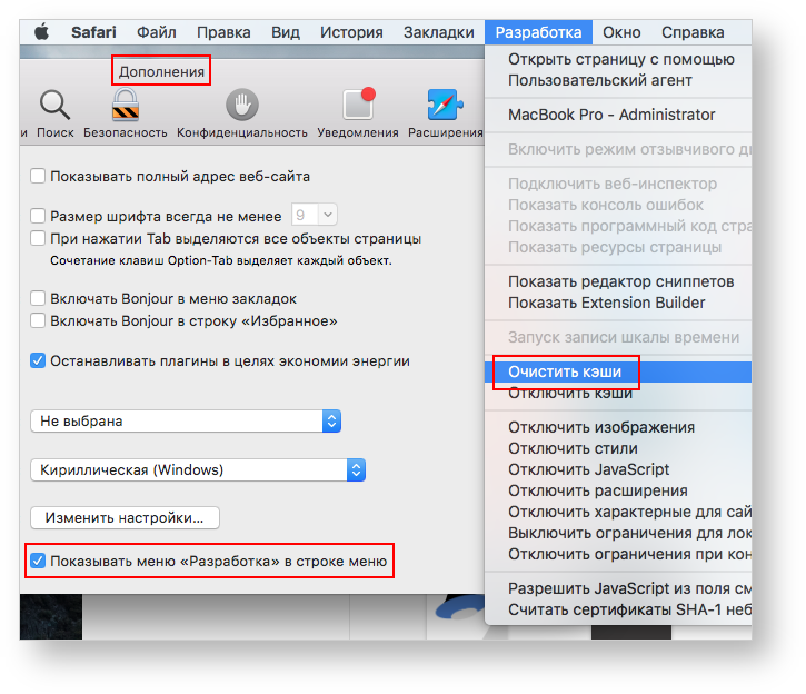 Для очистки кэша браузера нужно нажать сочетание клавиш ⌥ + ⌘ + E или выполнить следующие действия: