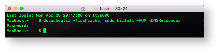Для очистки кэша DNS нужно запустить терминал. В терминале следует выполнить команды в соответствии с используемой версией операционной системы (при запросе пароля следует указать пароль пользователя macOS):