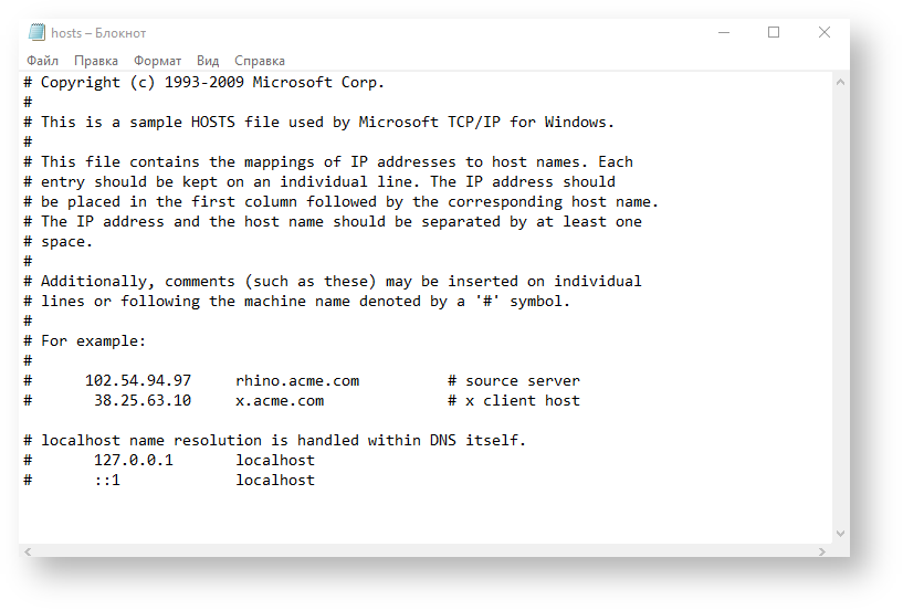 Если файл hosts отличается от примеров, приведенных ниже, то необходимо удалить лишние (отсутствующие в соответствующем используемой ОС примере) строчки, и затем выполнить сброс кэша DNS.