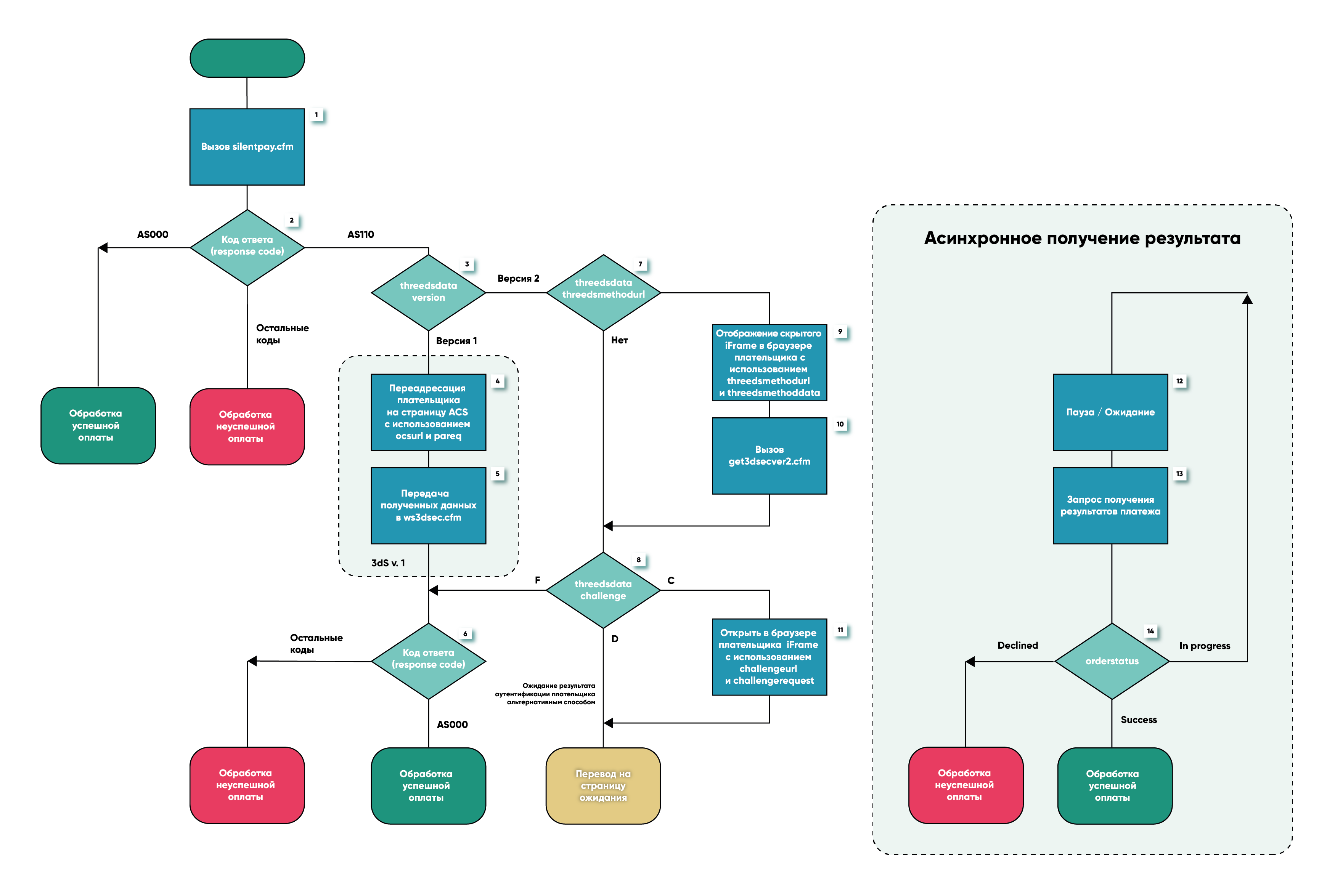 - При отсутствии URL банка-эмитента threeDSMethodURL и когда дополнительное взаимодействие с держателем карты не требуется - Frictionless Flow (F), сразу же будет проведена транзакция в процессинге, и процесс оплаты будет завершен (блок 6). Предприятие получит результат аутентификации и статус оплаты сразу в ответе на вызов сервиса silentpay.