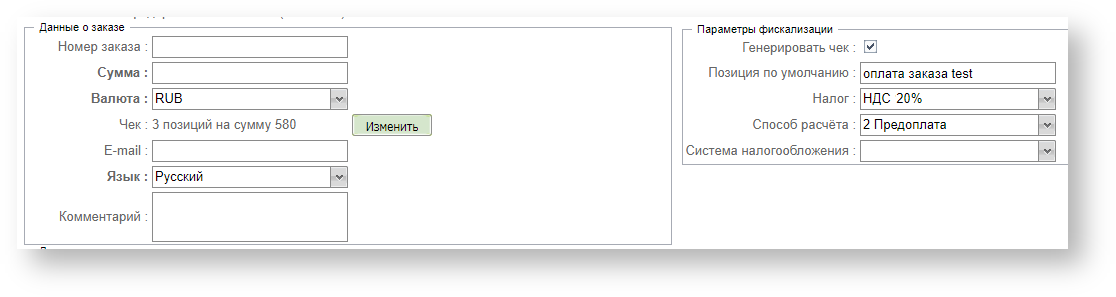 Если предприятие работает с передачей чека, то при подготовке платежа возможно указание позиций чека и их параметров. Для этого необходимо нажать кнопку «Изменить» в секции «Данные о заказе». Если кнопка «Изменить» неактивна, то предприятие не работает с чеком, для включения этой функции следует обратиться в службу поддержки Assist. После нажатия кнопки «Изменить» откроется новое окно «Позиции чека».