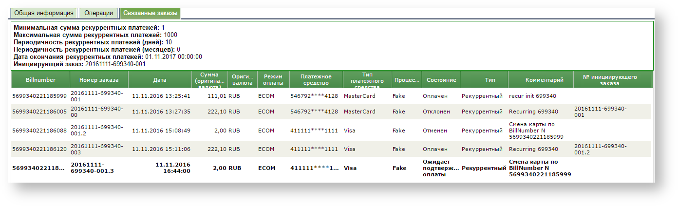 Также информация по блокировочному платежу отображается во вкладке «Связанные заказы» при детализации любого из платежей в данной подписке. Поле «Комментарий» отражает причину появления блокировочного платежа.