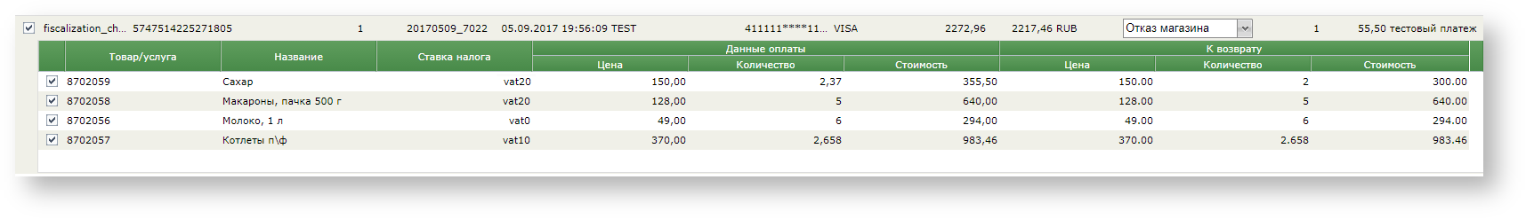 Если при создании заказа были переданы данные чека, то двойной клик на таком заказе в окне возврата денежных средств открывает новое окно, в котором отображаются позиции заказа. Отмена таких заказов осуществляется только с помощью полной или частичной отмены их позиций.