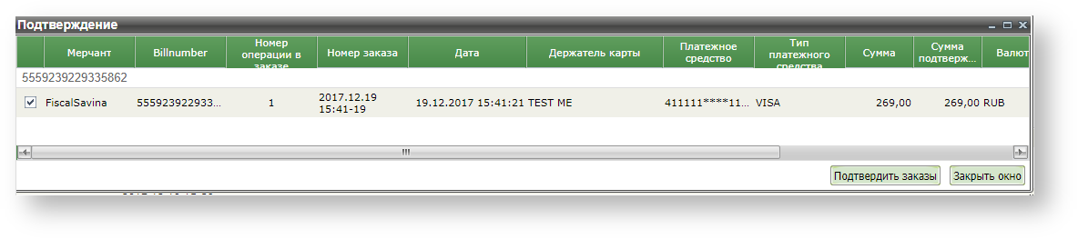 После нажатия кнопки «Подтвердить заказы» в колонке «Результат» отображается результат для каждого заказа, по которому производилось снятие денежных средств. В случае неуспеха отображается соответствующая ошибка.
