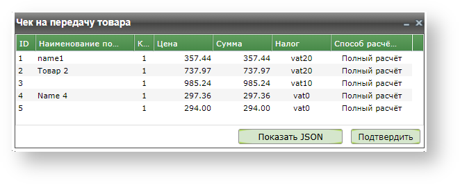 Отображение чека на передачу товара в формате JSON