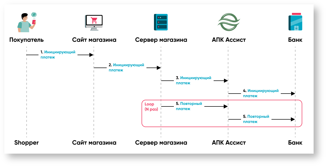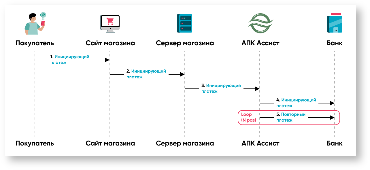 5. Заданное количество раз через заданные промежутки времени АПК Ассист проводит авторизацию (оплату) в банке-эквайере, осуществляется межбанковская транзакция, результат оплаты отображается на сайте магазина.