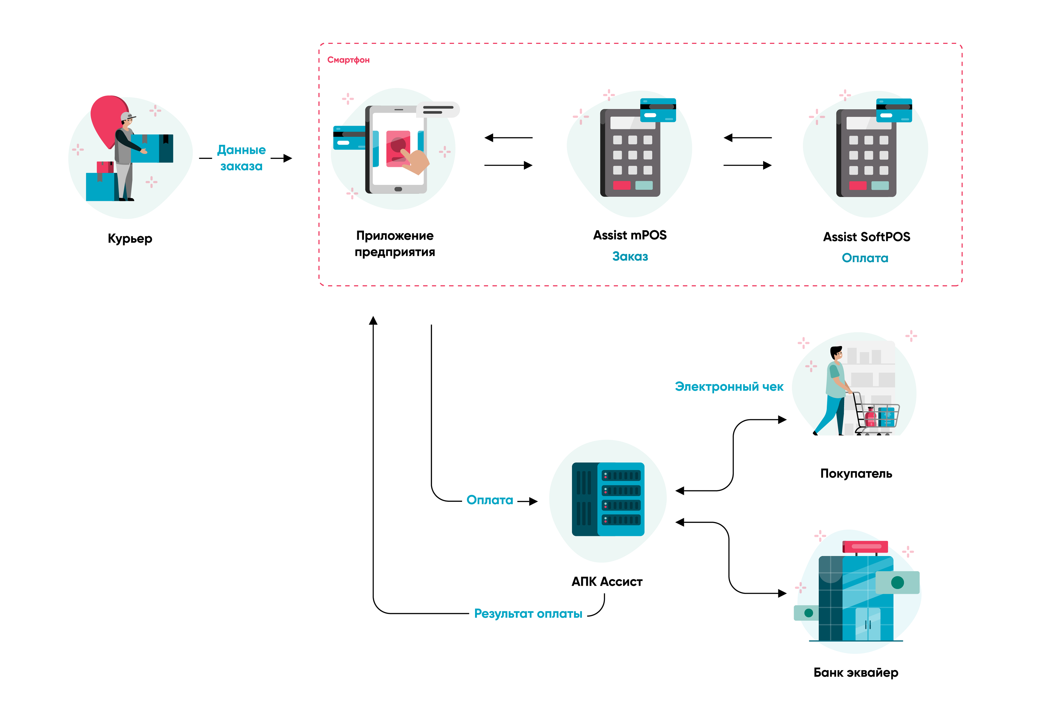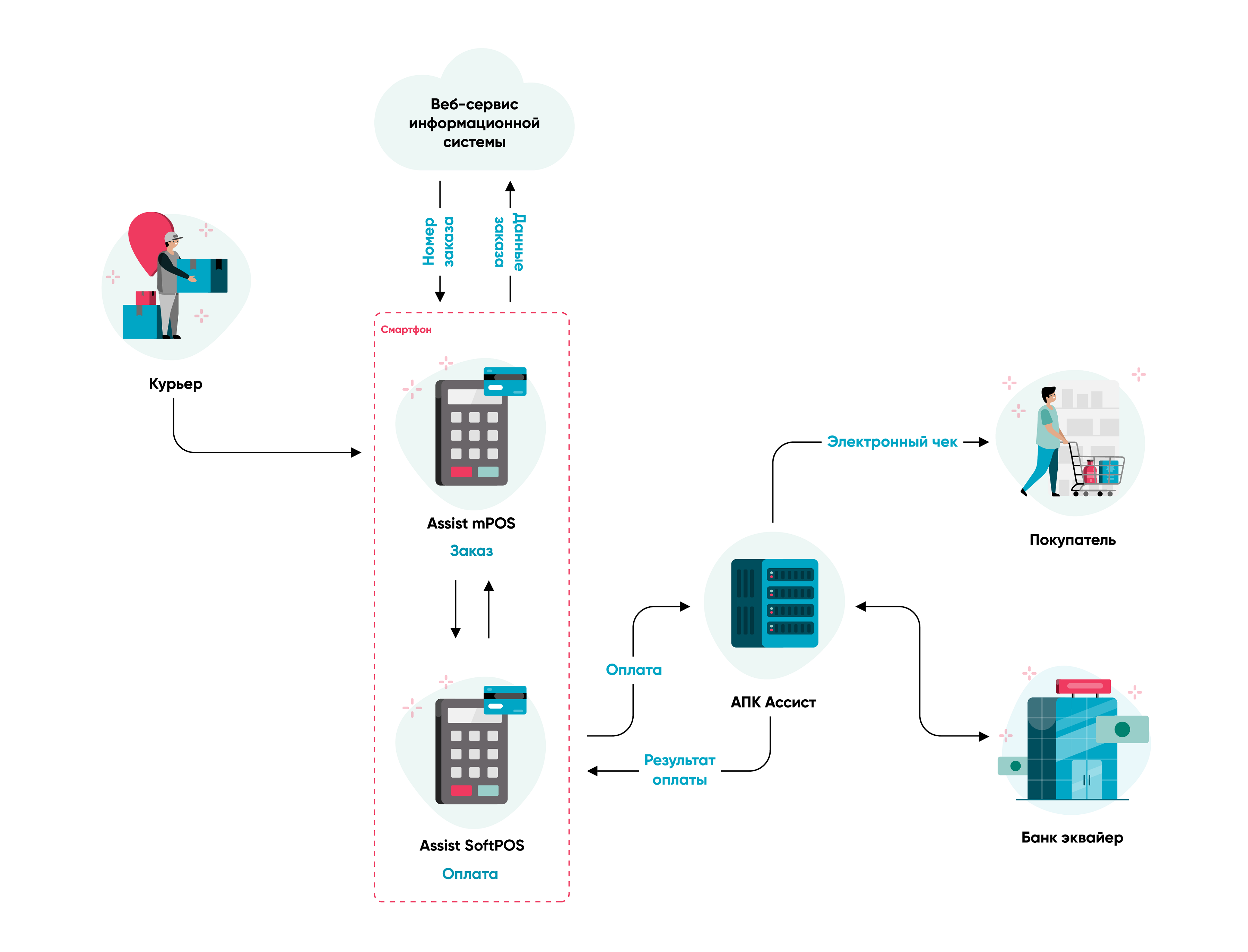 Мобильное приложение Assist SoftPOS может использоваться по-разному в зависимости от технологии работы курьерской службы (мобильного офиса). Возможны два варианта получения данных заказа для оплаты доставленного курьером заказа или товара (услуги) в мобильном офисе.