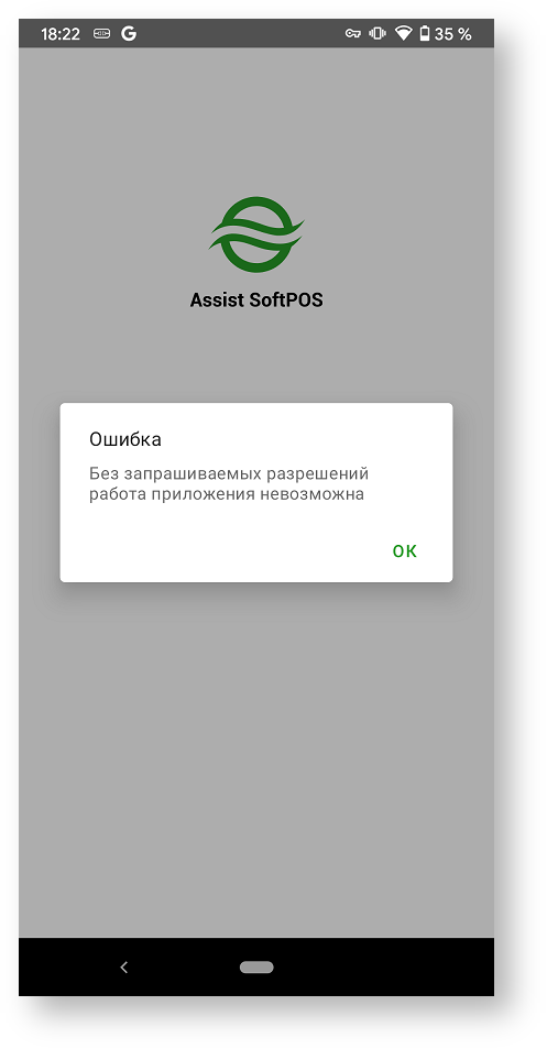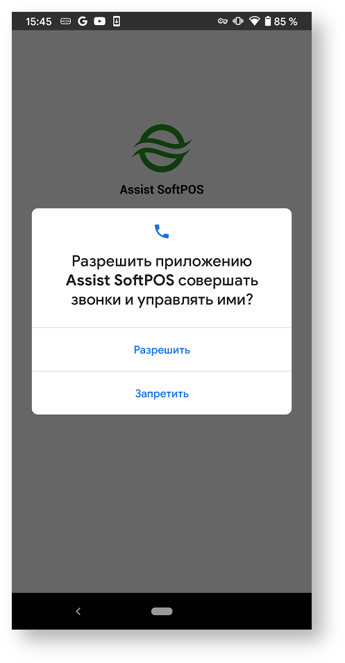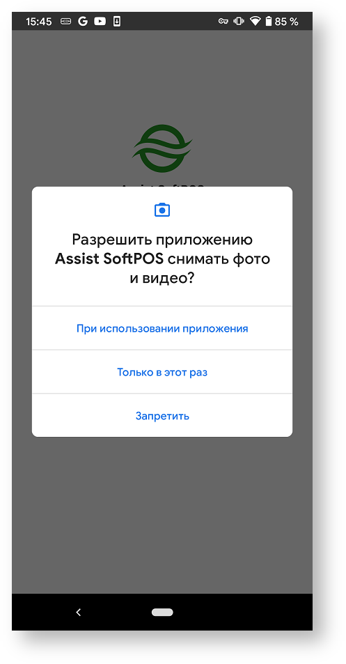 При первоначальном запуске приложения Assist SoftPOS необходимо подтвердить разрешение использования этим приложением камеры и телефона:
