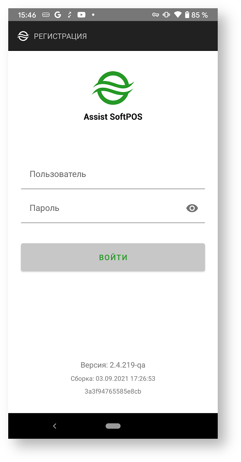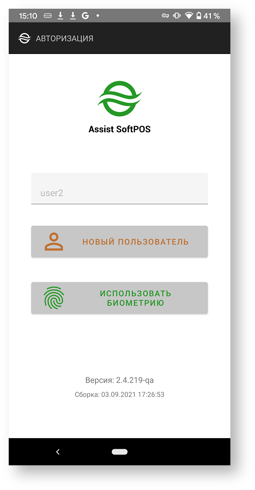При первоначальном запуске приложения Assist SoftPOS необходимо зарегистрировать нового пользователя приложения. Для этого используются наименование учетной записи пользователя и пароль, выданные администратором системы.
