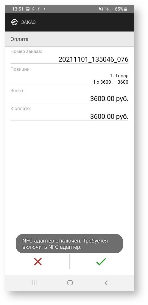 Выбор кнопки «Χ» означает отказ от оплаты, выбор кнопки «» запускает процесс оплаты заказа.