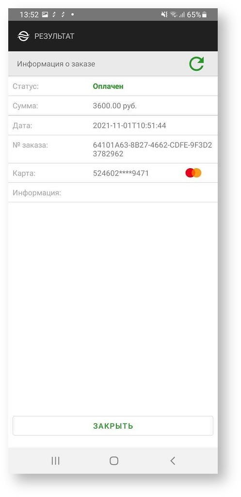 После нажатия кнопки «Закрыть» осуществляется возврат в приложение Assist mPOS.